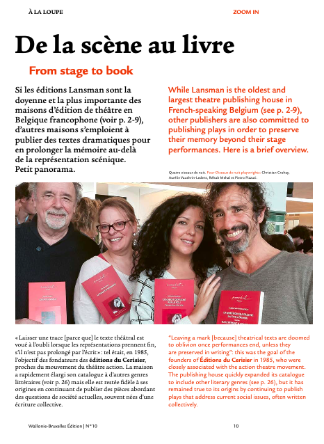 L’édition théâtrale est mise à l’honneur dans la revue Wallonie-Bruxelles Edition dans un article intitulé « De la scène au livre ».