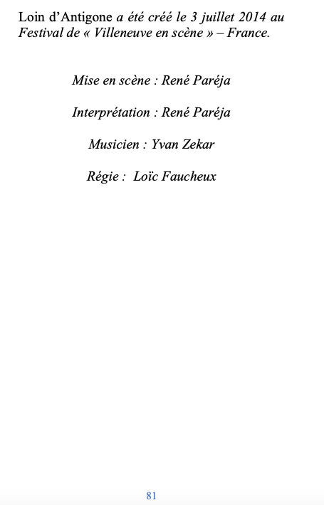 « Loin d’Antigone » invente et met en scène Renatos, un frère de Jocaste de Créon, qui s’est enfui de Thèbes et a trouvé refuge chez un ami musicien. Nullement intéressé par le pouvoir, amoureux des arts et de la beauté, Renatos donne sur les événements dramatiques auxquels il a assisté le point de vue horrifié de celui qui déteste toute violence.