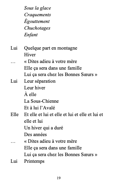 Lui, l’Avalé, a grandi chez les Bonnes Sœurs ; il ne savait pas qu’il avait une famille. Elle, la Sous-chienne, fut internée à l’adolescence pour raisons “administratives”. Sa famille, son passé, elle les a avalés, étouffés, gardés secret dans un coffre.