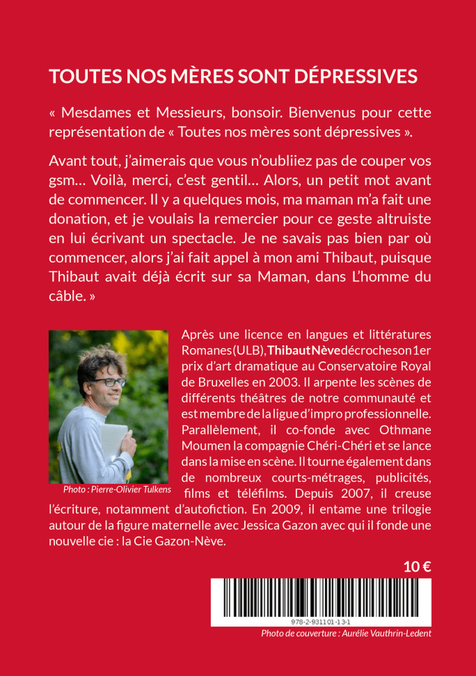 « Mesdames et Messieurs, bonsoir. Bienvenus pour cette représentation de « Toutes nos mères sont dépressives ». Avant tout, j’aimerais que vous n’oubliiez pas de couper vos gsm… Voilà, merci, c’est gentil … Alors, un petit mot avant de commencer. Il y a quelques mois, ma maman m’a fait une donation, et je voulais la remercier pour ce geste altruiste en lui écrivant un spectacle. Je ne savais pas bien par où commencer, alors j’ai fait appel à mon ami Thibaut, puisque Thibaut avait déjà écrit sur sa Maman, dans L’homme du câble. »